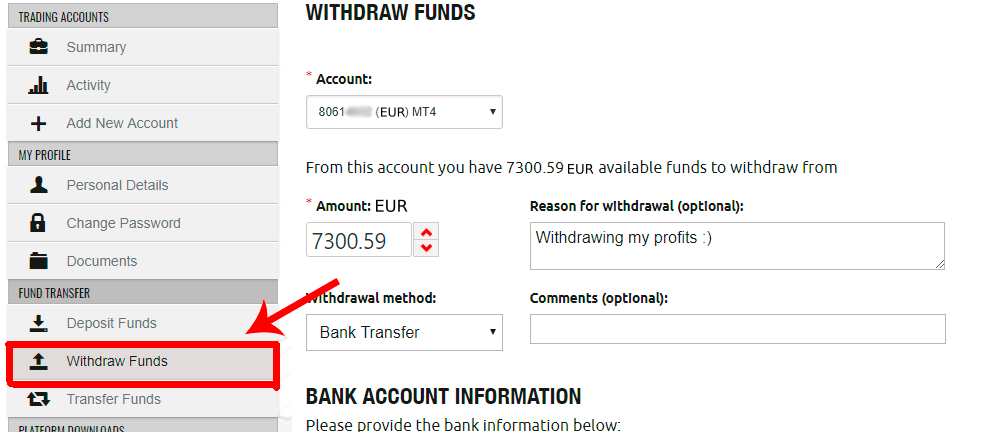 Zoals je op de onderstaande screenshot kunt zien, besloot ik om de 'geld opnemen' functie te gebruiken om € 7.300,59 van mijn account op te nemen.